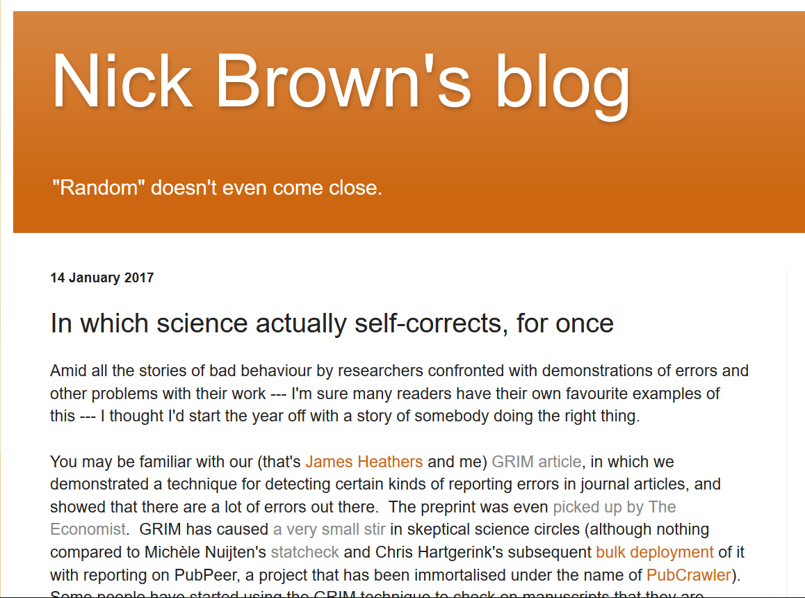 Nick Brown, de persoon die een grote rol speelde in het blootleggen van fouten in Babara Fredricksons publicatie naar de positiviteitsratio heeft een onderzoek van Mueller & Dweck (1998) kritisch geanalyseerd. Hij heeft hierover de blog post geschreven met als titel In which science actually self-corrects, for once. Brown heeft een wiskundige techniek, GRIM, ontwikkeld aan de hand waarvan hij onregelmatigheden kan opsporen in resultatentabellen van oude publicaties. Met deze techniek heeft hij in vele publicaties vele fouten opgespoord. Hij heeft deze techniek ook losgelaten op het artikel van Mueller en Dweck en ook hier inconsistenties en merkwaardigheden in aangetroffen.